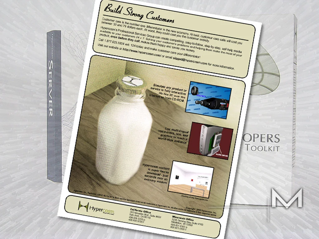 In another lifetime, I worked for an internet start-up company. This company was far ahead of it’s time, showcasing 3D applets online. I worked as the art director (which just meant I did everything that was the face of the company). During my time there, I was in charge of creating and launching numerous versions of the corporate website and specialty websites dedicated to different services Hypercosm provided. Below are just a few panels of the work I did while there including software packaging and DVD authoring + magazine adverts + websites.
