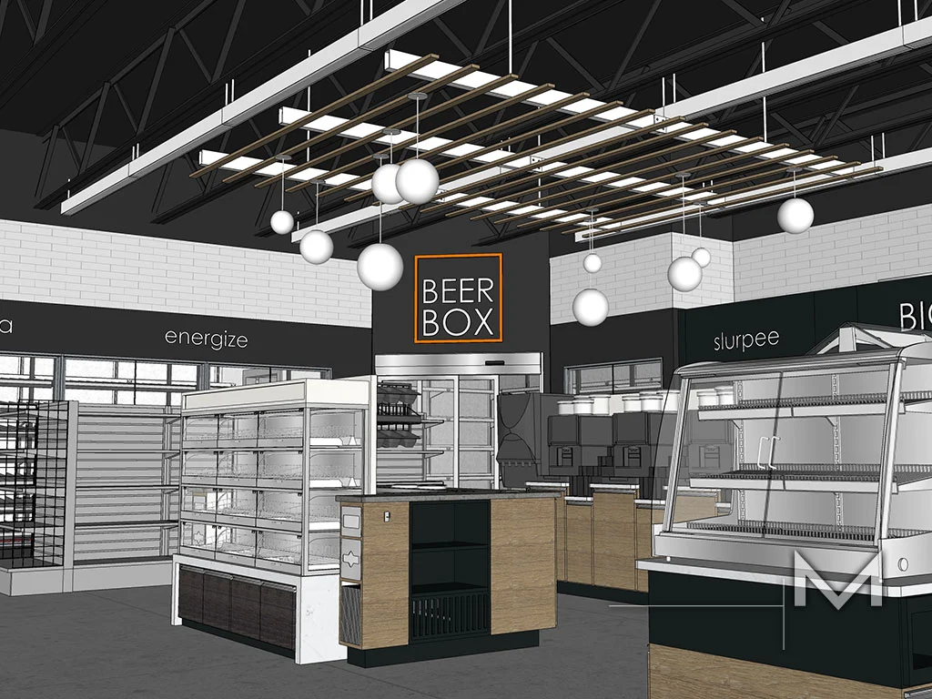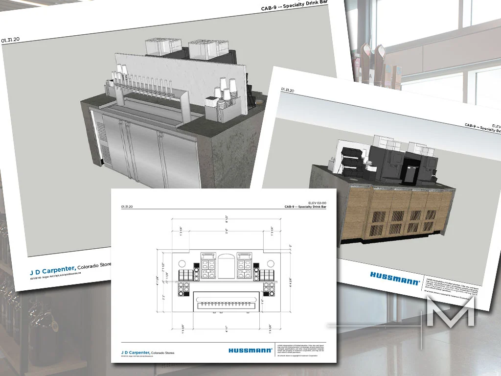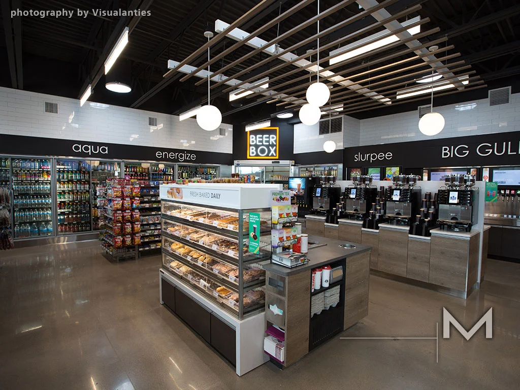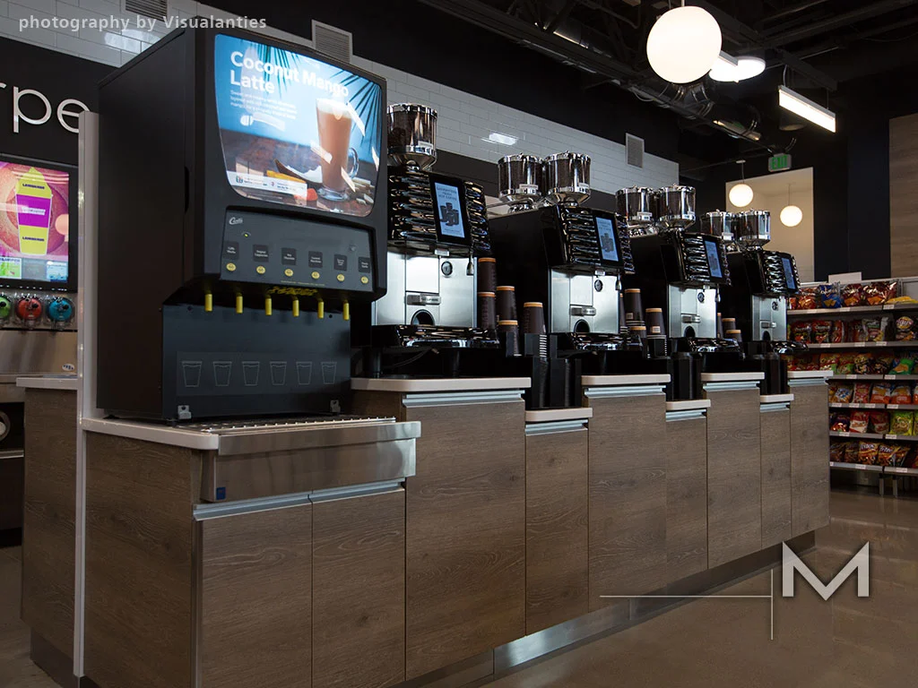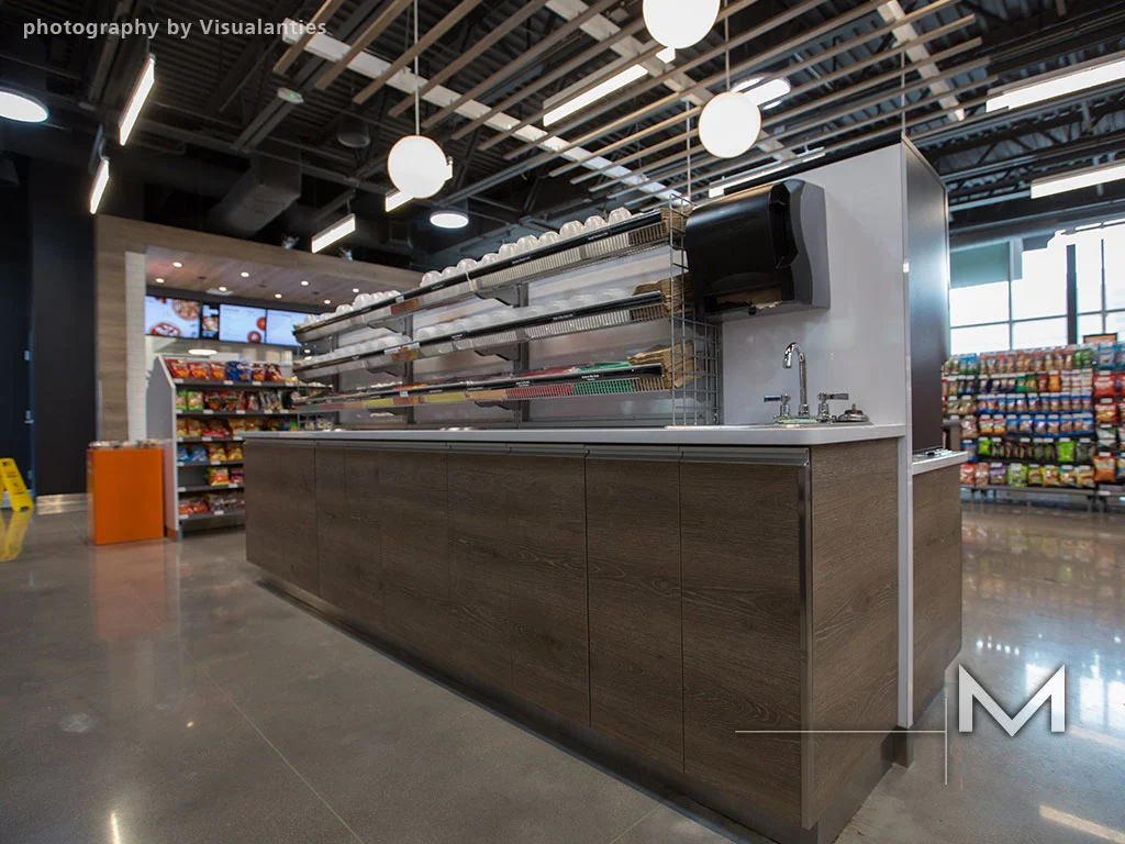 When Dave Carpenter approached us, little did we know the rollercoaster we were in for. We helped develop key features inside including a very custom bakery case, an ambient / heated display, and specialty beverage island. Below are some of the last interior renderings, details, and some interior shots courtesy of Visualanties (local photographer hired by Hussmann).